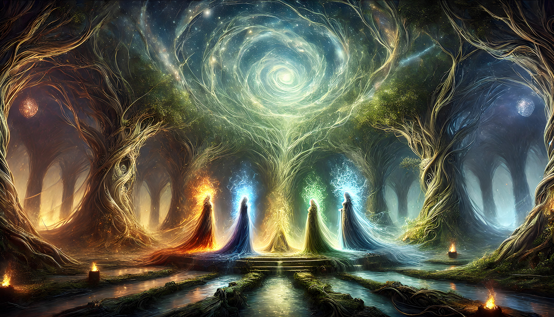 On a night where the sky shimmered with a confluence of starlight and aurora, the queens convened in a neutral haven. The ancient glade, known to the people as the Convergence Grove, sat at the very centre of the world - a sacred space where the lines between realms had always blurred. Here, beneath an ancient canopy of towering trees entwined with luminescent vines, the four monarchs met in solemn assembly.